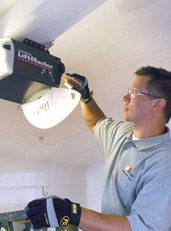 With the Learn button identified, the next step is to press and hold it for about half a minute. While you have the Learn button depressed, push and release the button on the universal garage door remote with your other hand. The opener’s light bulb should flash once to acknowledge that the motor and remote are now in sync. That’s it!